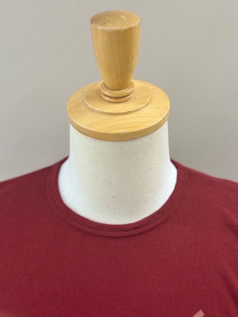 丸襟(継ぎ目がない)は丸編みしたフライスを用い、1.6mm巾のタコバインダーを共地縦取り仕様と手の込んだ作りです。