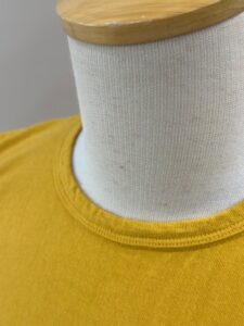 丸襟(継ぎ目がない)は丸編みしたフライスを用い、1.6mm巾のタコバインダーを共地縦取り仕様と手の込んだ作りです。