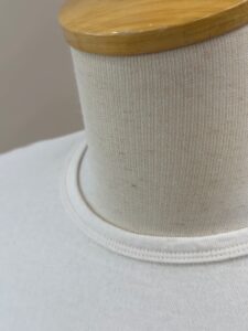 丸襟(継ぎ目がない)は丸編みしたフライスを用い、1.6mm巾のタコバインダーを共地縦取り仕様と手の込んだ作りです。