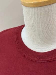 丸襟(継ぎ目がない)は丸編みしたフライスを用い、1.6mm巾のタコバインダーを共地縦取り仕様と手の込んだ作りです。