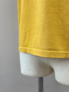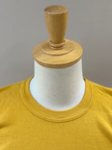 丸襟(継ぎ目がない)は丸編みしたフライスを用い、1.6mm巾のタコバインダーを共地縦取り仕様と手の込んだ作りです。