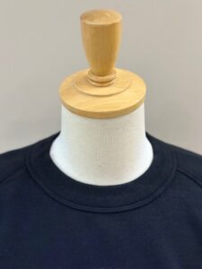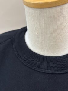 主要縫製は表裏40番綿糸を用い2本針縫製を施し、襟は継ぎ目のない丸襟(フライス)を選定し、