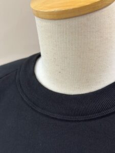 主要縫製は表裏40番綿糸を用い2本針縫製を施し、襟は継ぎ目のない丸襟(フライス)を選定し、
