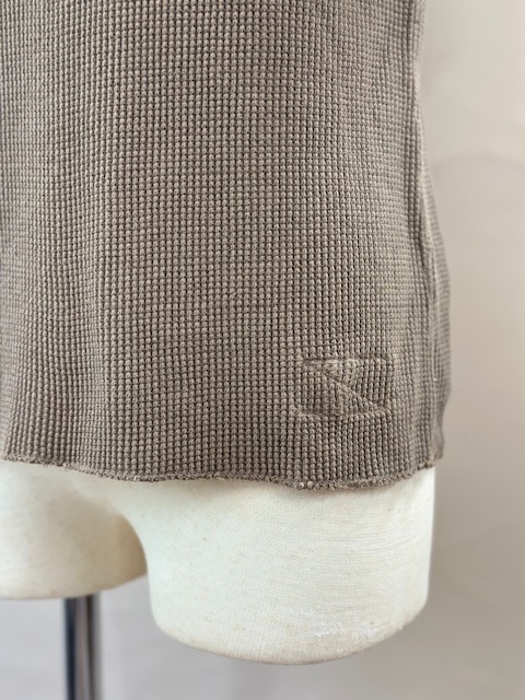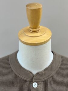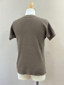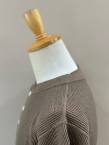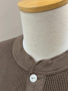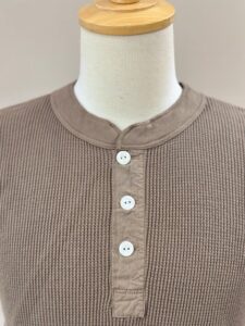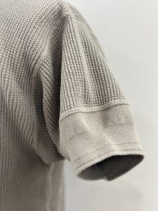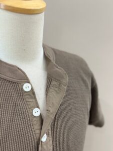 前立てには別布を用い、袖口には別途編み立てた片畦編みの横付属を選定し、クラシカルでシンプルなヘンリーネックワッフルTee。