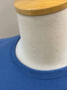 丸襟(継ぎ目がない)は丸編みしたフライスを用い、1.6mm巾のタコバインダーを共地縦取り仕様と手の込んだ作りです。