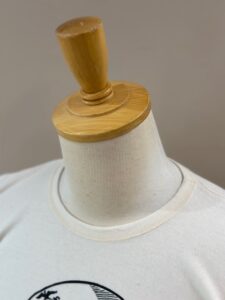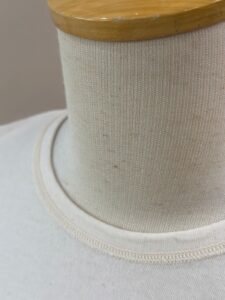 丸襟(継ぎ目がない)は丸編みしたフライスを用い、1.6mm巾のタコバインダーを共地縦取り仕様と手の込んだ作りです。
