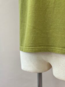 丸襟(継ぎ目がない)は丸編みしたフライスを用い、1.6mm巾のタコバインダーを共地縦取り仕様と手の込んだ作りです。