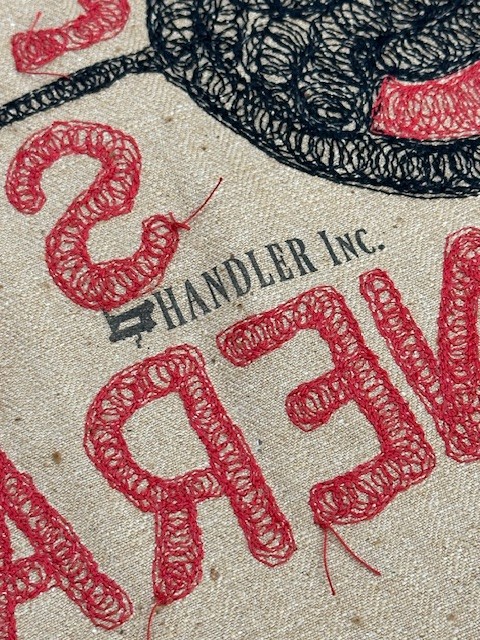 刺繍は桐生のハンドラー様に依頼。8番綿糸を用いハンドルミシンで1枚1枚個体差がある刺繡を施しております。