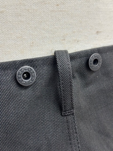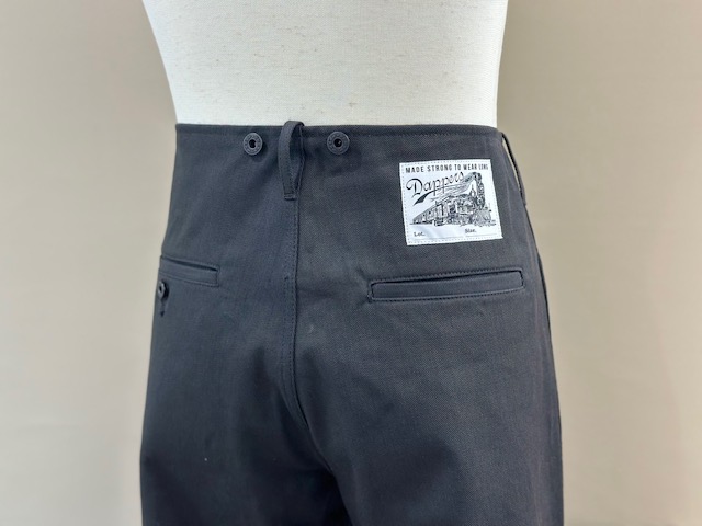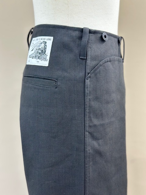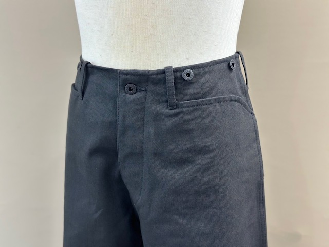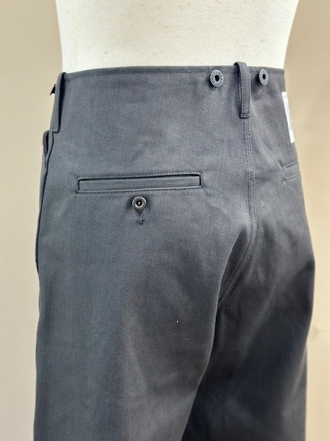 5本ベルトループや月桂樹ボタン、コインポケット省略など簡素化されたディテールが特徴的な一着。