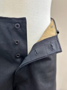腰裏見返しにはキャメルのへリンボンファブリックを選定し、30番綿糸6.8mm巾2本針環縫い縫製にて仕上げております。