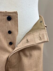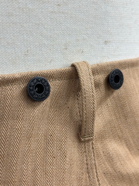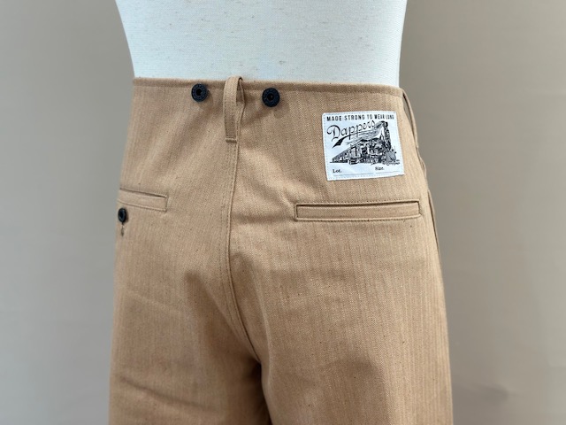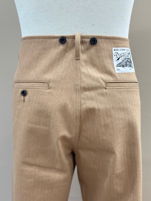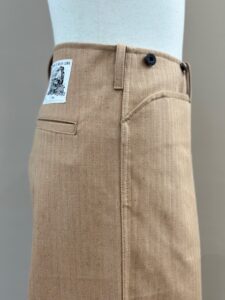 腰裏見返しにはキャメルのへリンボンファブリックを選定し、30番綿糸6.8mm巾2本針環縫い縫製にて仕上げております。