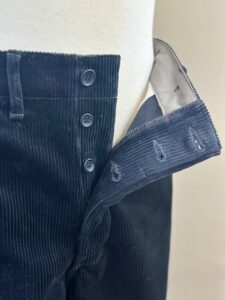 ボタンホールが付く見返し部分を腰回り同様の別布コットンサージ生地に変更。