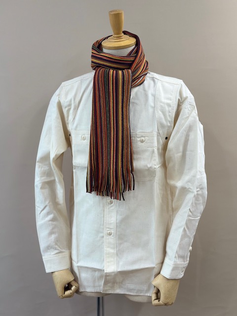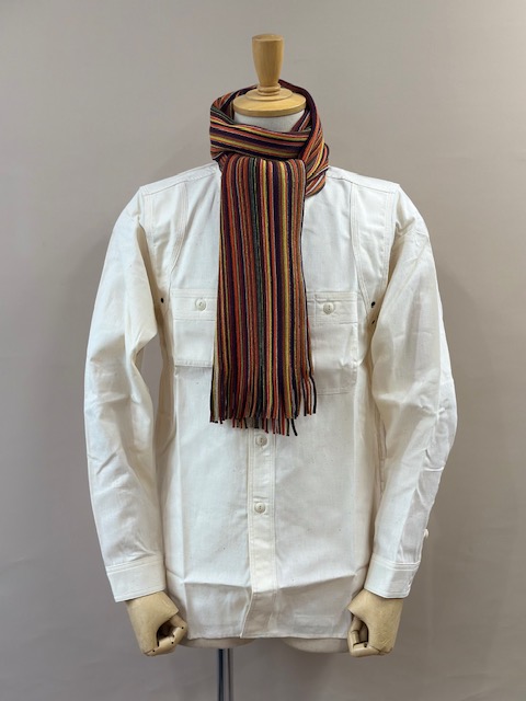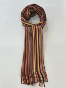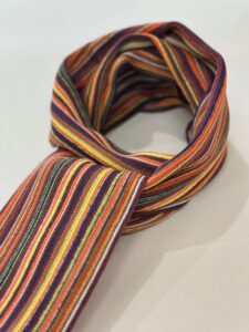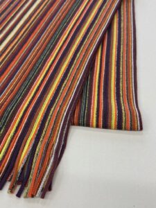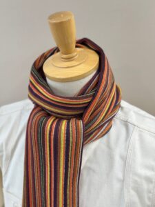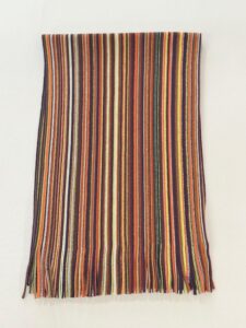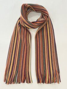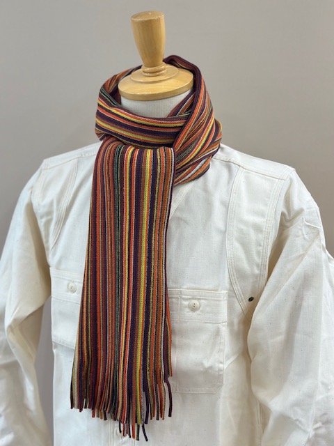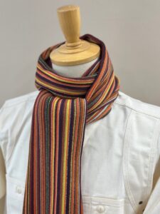 伸縮性があり色鮮やかなストライプ柄が特徴的で、ここ近年改めて注目されてきているラッセル編みマフラーです。