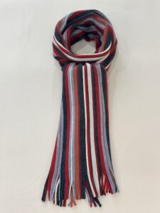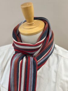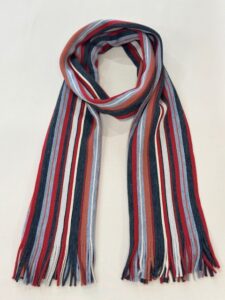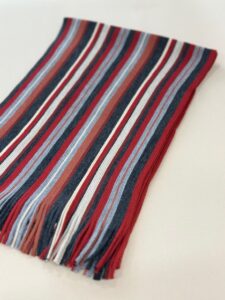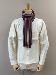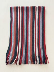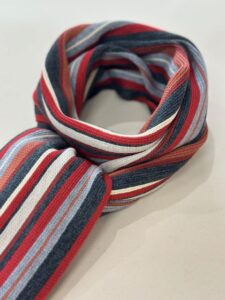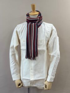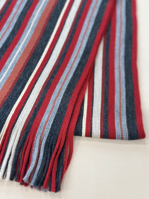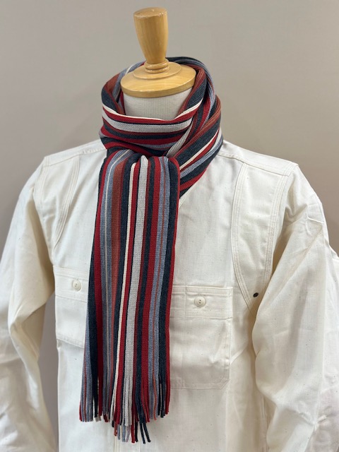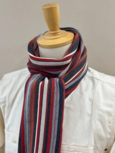 伸縮性があり色鮮やかなストライプ柄が特徴的で、ここ近年改めて注目されてきているラッセル編みマフラーです。