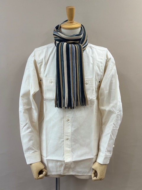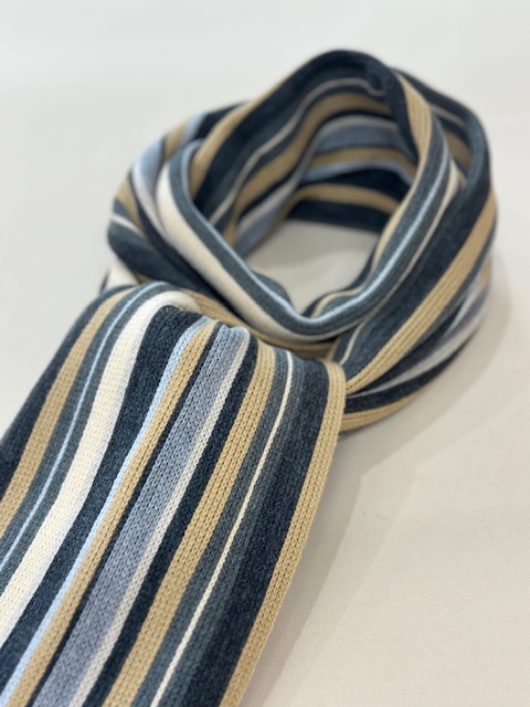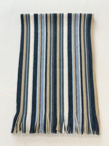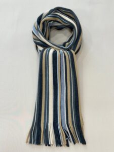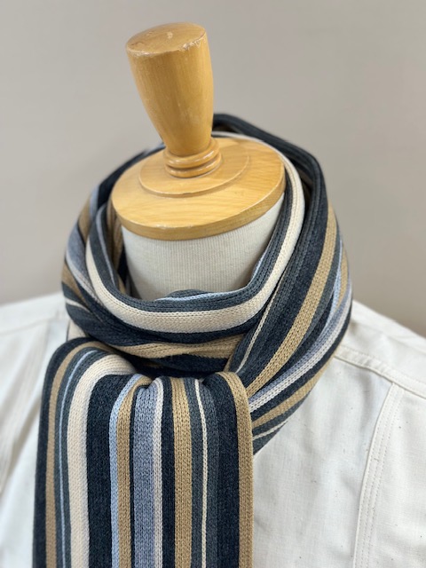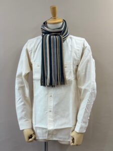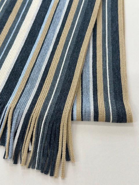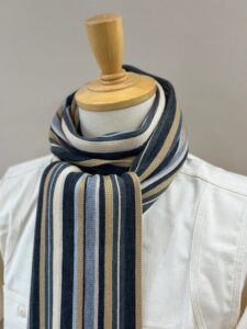 伸縮性があり色鮮やかなストライプ柄が特徴的で、ここ近年改めて注目されてきているラッセル編みマフラーです。
