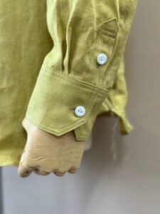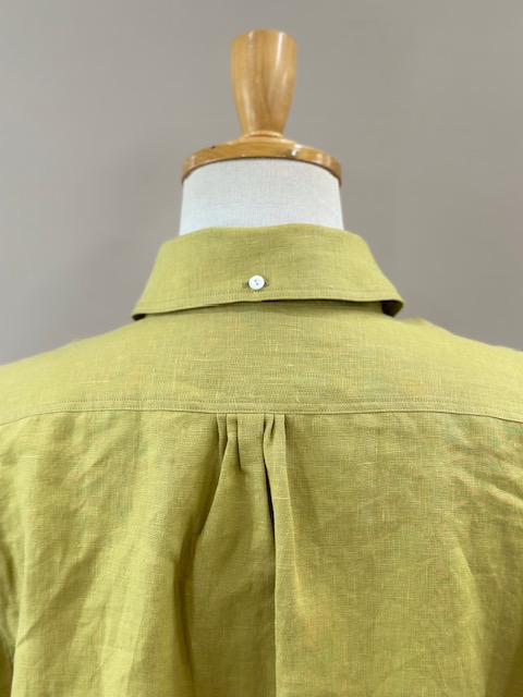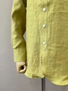 台襟が高くトップボタンが2つ付く襟元が特徴的でラウンドカラーのボタンダウンにする事で優しい印象を与えてくれます。