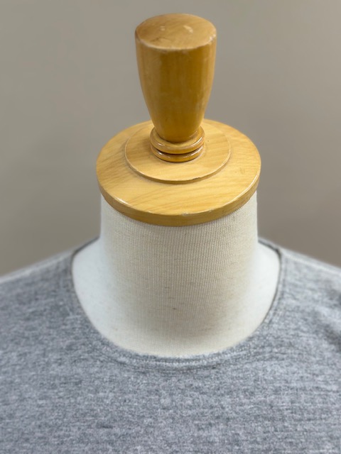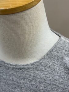 古いアンダーウェアの襟周りの仕様を取り入れ、背あてを当て込み、片畦編みの横付属を袖口に配置し、