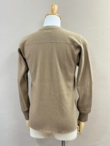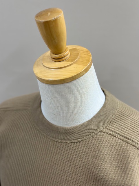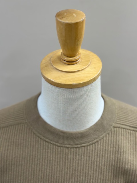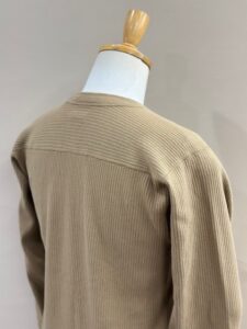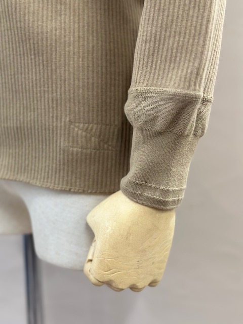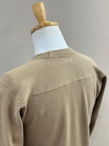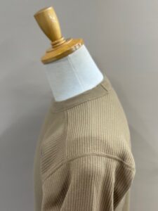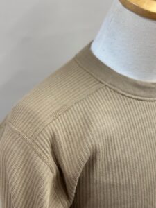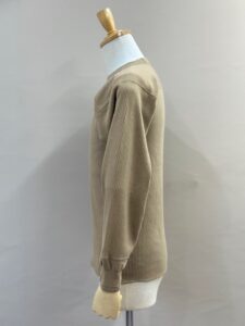 袖リブの横付属も旧い編み機で編み立てた片畦リブを用いる事でよりクラシカルな印象を与えてくれます。