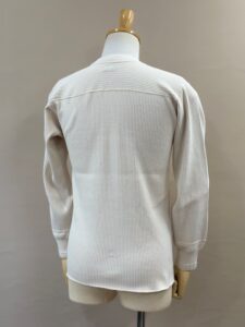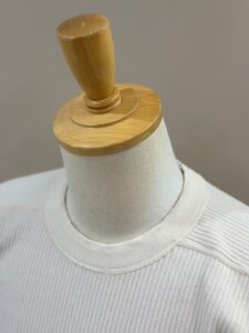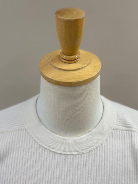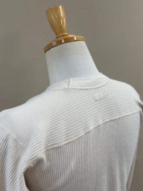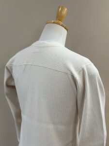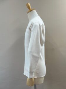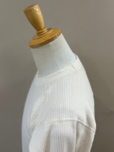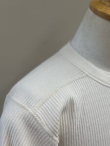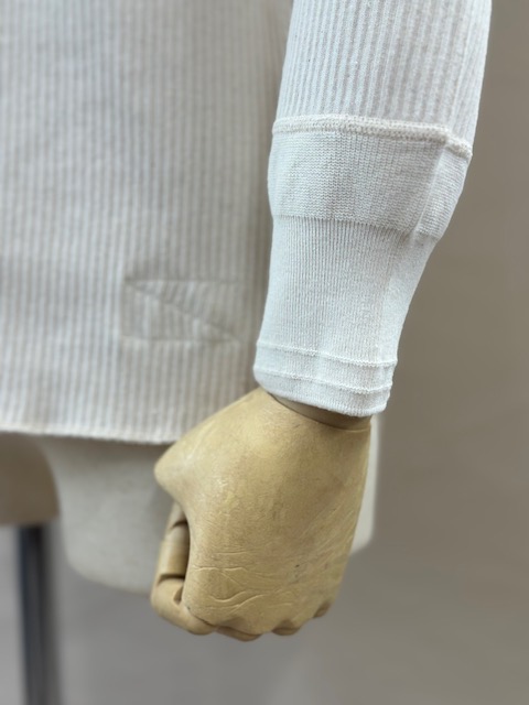 袖リブの横付属も旧い編み機で編み立てた片畦リブを用いる事でよりクラシカルな印象を与えてくれます。