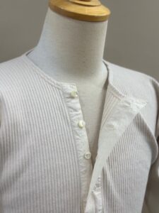 下前立ては別布を用い貝ボタンを配置する事でよりクラシカルな印象を与えてくれます。