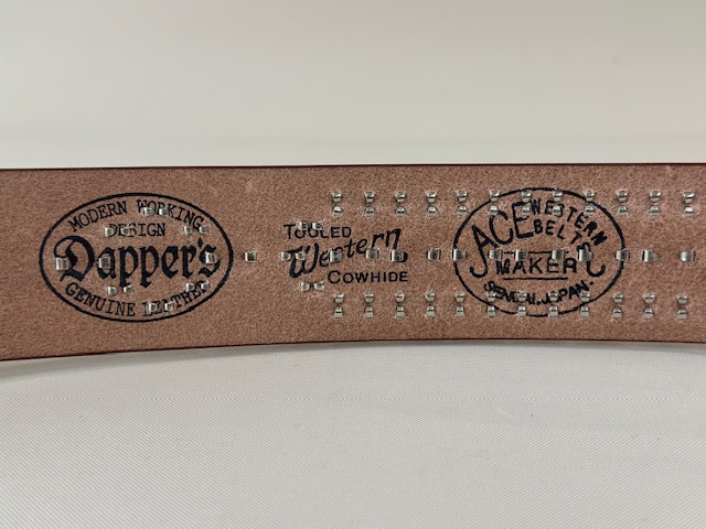 MATERIAL 【BELT】ACE's ORIGINAL 43mm×2.7mm TOP-GRAIN COWHIDE 7oz Made in Japan 【BUCKLE】 ACE's ORIGINAL VINTAGE REPRODUCTION PRESSED STEEL 《鉄製》 Made In Japan 【EMBOSS】 ACE's ORIGINAL VINTAGE REPRODUCTION EMBOSS.Late 1940s, Made In Japan 【JEWEL RING】ACE's ORIGINAL VINTAGE REPRODUCTION, Brass on nickel finish, Made In the USA by skilled Craftsmen. 【JEWEL】 世界初 ACE's ORIGINAL VINTAGE REPRODUCTION, Perfect jewel, Made In Japan This is a reflector on the bottom, which sparkies when exposed to sunlight or light. 【SPOTS】 Brass on nickel finish, The Standard Rivet and other American companies.